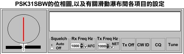雖然在說明檔中﹐作者建議使用的模式為USB﹐但是他也沒有詳細的明記解釋他的理由。但是﹐在LSB模式下工作﹐好像也沒有產生什麼問題吧。像RTTY下常發生的頻率偏移現象﹐在PSK31下決對不會有這方面的問題。在PSK31SBW畫面中有個"AFC"的選單﹐請勿忘務必在框框中打上〝ˇ〞﹐所謂的AFC就如同家用FM諧調器具備的機能一樣﹐它是英文全名為〝Automatic Frequency Control〞的縮寫。這個機能就是當你旋轉頻率旋鈕要去選取與受信頻率同基調時﹐一旦調靠近同基調點時﹐它就會將對手電台的頻率自動地引導進入同調點。因為PSK31的同調基準點一旦偏移了10Hz左右便無法復歸回來﹐所以〝AFC〞的選單務必上〝ˇ〞即ON的設定。